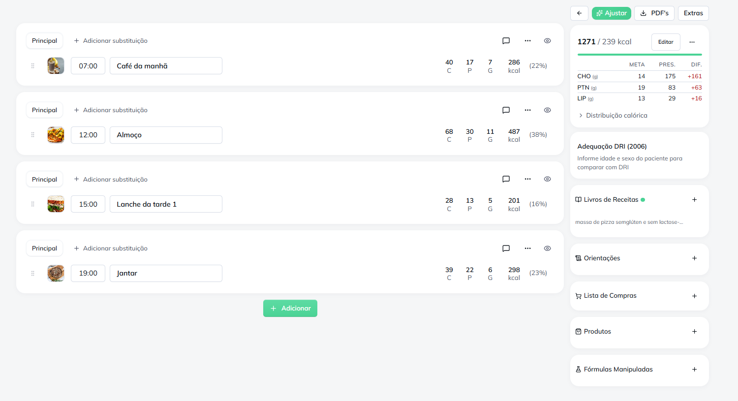 Você gasta 40 min por plano, gera PDF, cola no chat. O paciente abre uma vez, scrolla, esquece. Na próxima consulta, pergunta "qual mesmo era o lanche?".